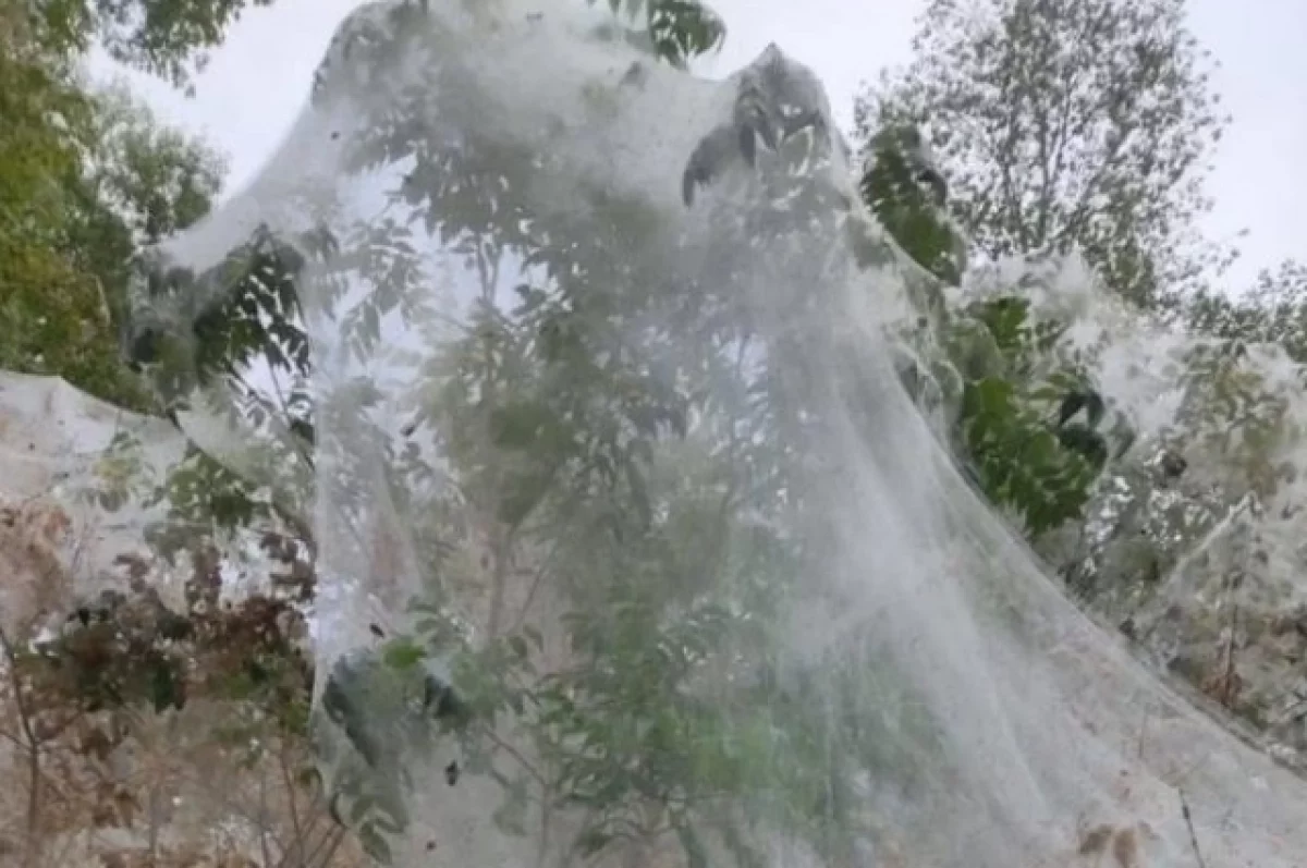 «Она начинает неуправляемо размножаться, формируя такие вот паутинные пологи для того, чтобы защититься от других потенциальных врагов. Эту паутину моль плетет в целях защиты, живет под ней и питается. Грубо говоря, моль создает себе жилище. Там же они окукливаются, а из этих куколок вылетают бабочки. Питаются листьями деревьев. Этим пологом они могут полностью окутать дерево!» — рассказал Виктор Кузеванов.