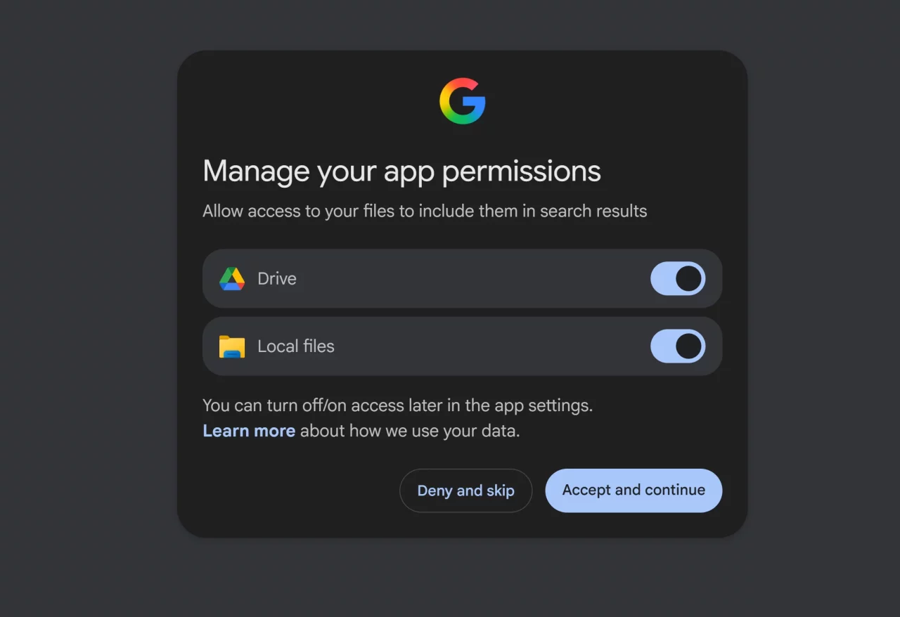 При первом запуске пользователю необходимо войти в свою учетную запись Google и предоставить приложению доступ к файлам на Google Drive и локальном компьютере. После этого приложение сможет индексировать и находить контент из всех указанных источников.