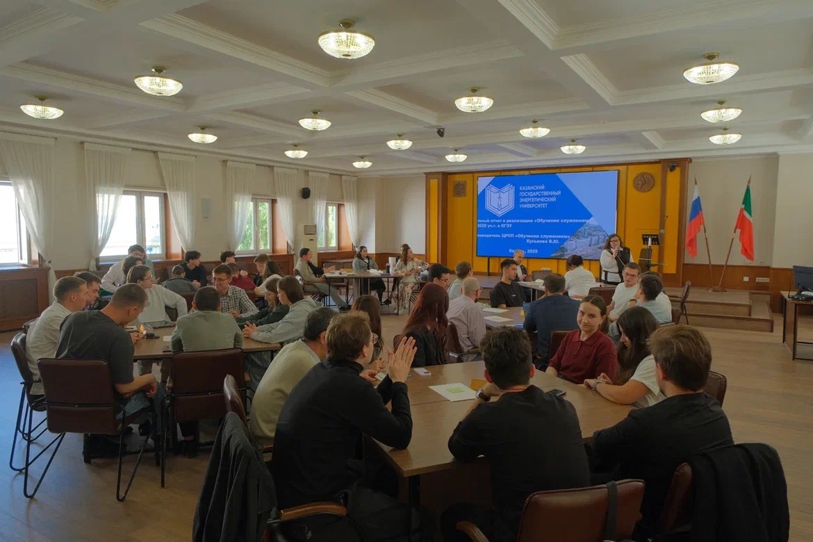 В ходе мероприятия были подведены итоги программы «Обучение служением» прошлого года. Публичный отчет о реализации программы "Обучение служением" в 2024/2025 уч.году в университете сделала профессор кафедры экономики и организации производства КГЭУ, руководитель Центра развития общественных проектов «Обучение служением» Варвара Кулькова.