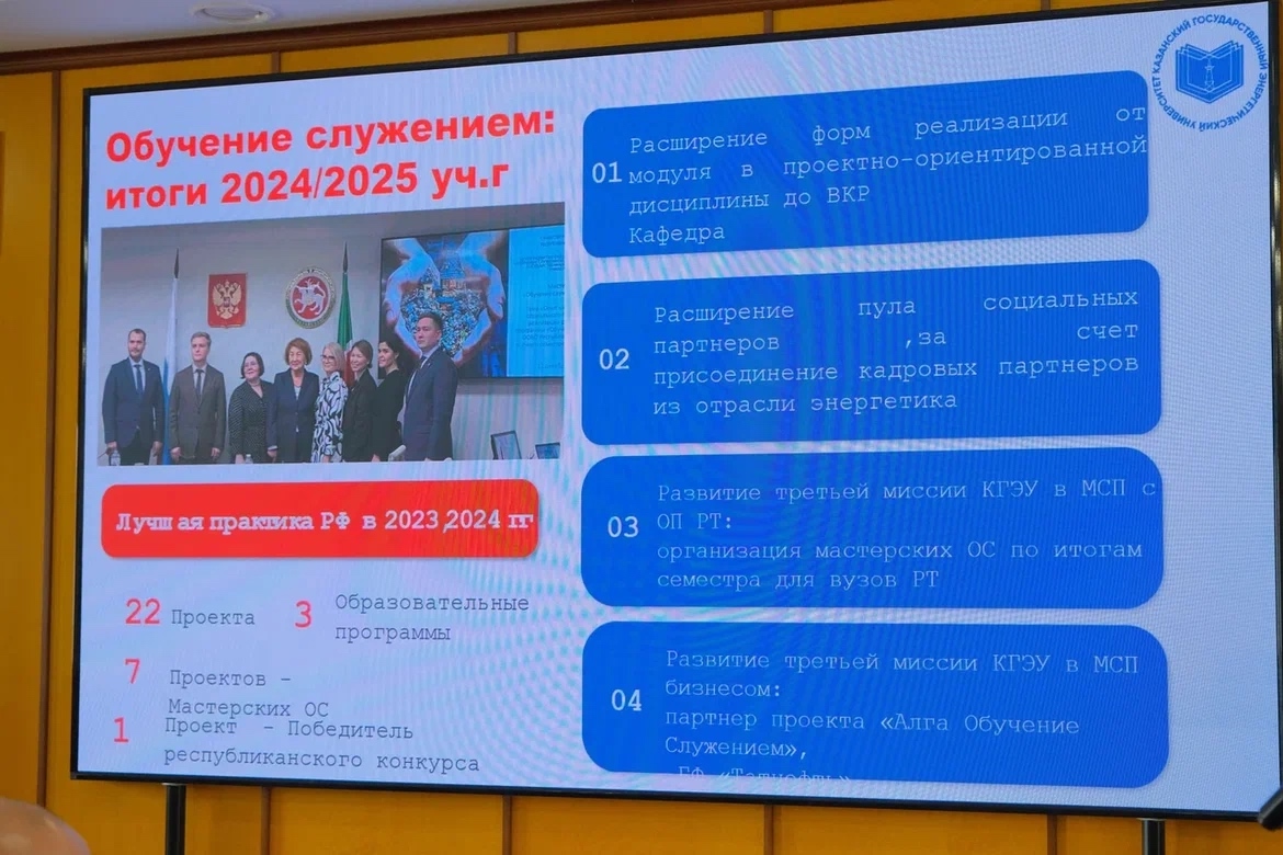 «Обучение служением» в КГЭУ это неотъемлемый компонент третьей миссии, который работает на развитие межсекторного социального партнерства в укреплении взаимодействий с некоммерческим сектором и социально ориентированным бизнес сообществом. В публичном отчете выделено особое место в развитии третьей миссии КГЭУ в контексте масштабирования опыта вуза с лучшей практикой «Обучение служением» в Республике Татарстан отводится партнерскому проекту «Алга Обучение Служением», поддержанному БФ «Татнефть» в рамках конкурса «Энергия добра» 2025 г.