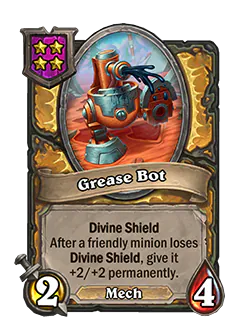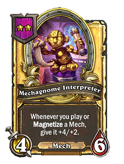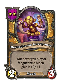 • New: 2/3. Whenever you play or Magnetize a Mech, give it +2/+1.