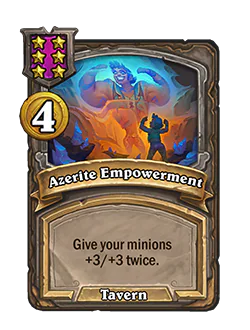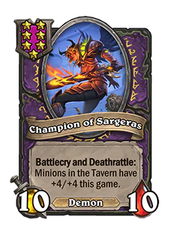 • New: 10/10. Battlecry and Deathrattle: Minions in the Tavern have +4/+4 this game.