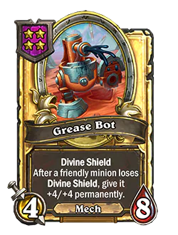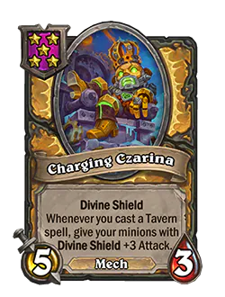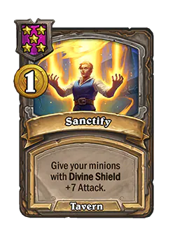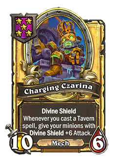 • New: 5/3. Divine Shield. Whenever you cast a Tavern spell, give your minions with Divine Shield +3 Attack.