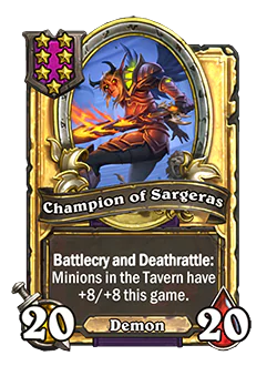 • Old: 12/12. Battlecry and Deathrattle: Minions in the Tavern have +5/+5 this game.