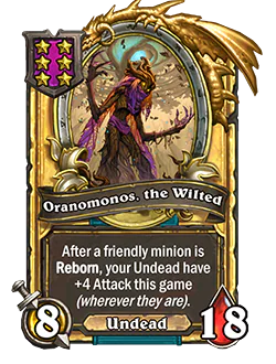 • Old: [Tier 5] 3/8. After a friendly minion is Reborn, your Undead have +1 Attack this game (wherever they are).