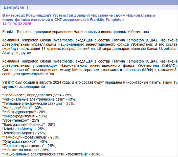 Сейчас Ротшильды через Franklin Templeton (тот самый фонд, через который они "заходили" 12 лет назад на Украину) планируют выкупить 40% акций национальных электросетей и оператора водных ресурсов страны "Узсувтаъминот", что пугает многих людей - Средняя Азия может лишиться огромной части национальных богатств.