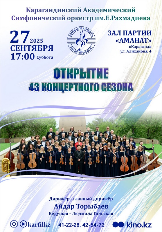 Карагандинский академический симфонический оркестр имени Еркегали Рахмадиева открывает 43-й творческий сезон. Музыканты ждут почитателей их таланта на концерте 27 сентября в 17:00 в зале здания партии «Аманат».