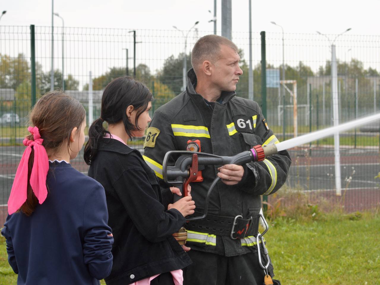 Особый интерес гимназистов вызвала выставка техники и оборудования МЧС: ребята примерили боевую форму и попробовали подать воду из пожарного ствола.