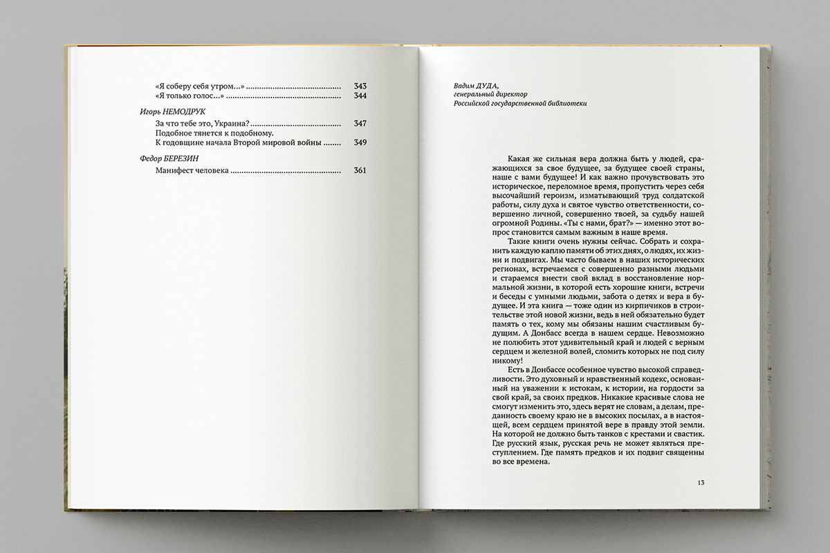 Генеральный директор Российской государственной библиотеки Вадим Дуда, обращаясь к читателям, подчёркивает: «Такие книги очень нужны сейчас. Собрать и сохранить каждую каплю памяти об этих днях, о людях, их жизни и подвигах. Мы часто бываем в наших исторических регионах, встречаемся с совершенно разными людьми и стараемся внести свой вклад в восстановление нормальной жизни, в которой есть хорошие книги, встречи и беседы с умными людьми, забота о детях и вера в будущее. И эта книга — тоже один из кирпичиков в строительстве этой новой жизни, ведь в ней обязательно будет память о тех, кому мы обязаны нашим счастливым будущим. А Донбасс всегда в нашем сердце. Невозможно не полюбить этот удивительный край и людей с верным сердцем и железной волей, сломить которых не под силу никому!»