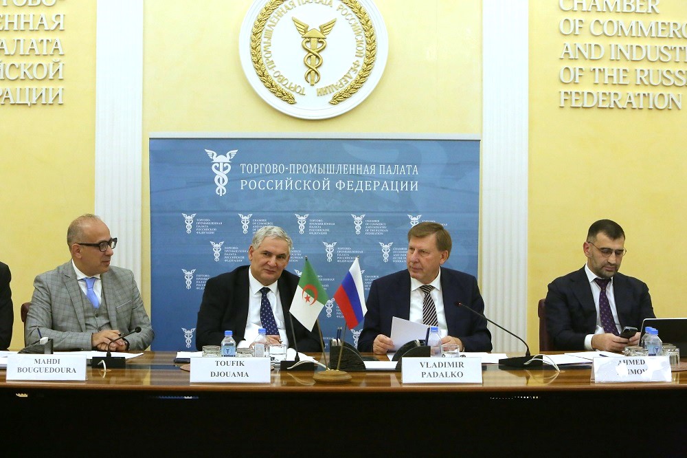В своем вступительном слове вице-президент ТПП РФ Владимир Падалко рассказал о результатах работы проведенной на палатском треке: «Порядка 400 российских предпринимателей посетили Алжир для участия в различных деловых мероприятиях, после крупной бизнес-миссии ТПП РФ в Алжир в апреле с.г.». Он также отметил наиболее перспективные сектора для выстраивания торгово-экономических отношений с Алжиром: сельское хозяйство, развитие инфраструктуры, туризм, образование и культура.