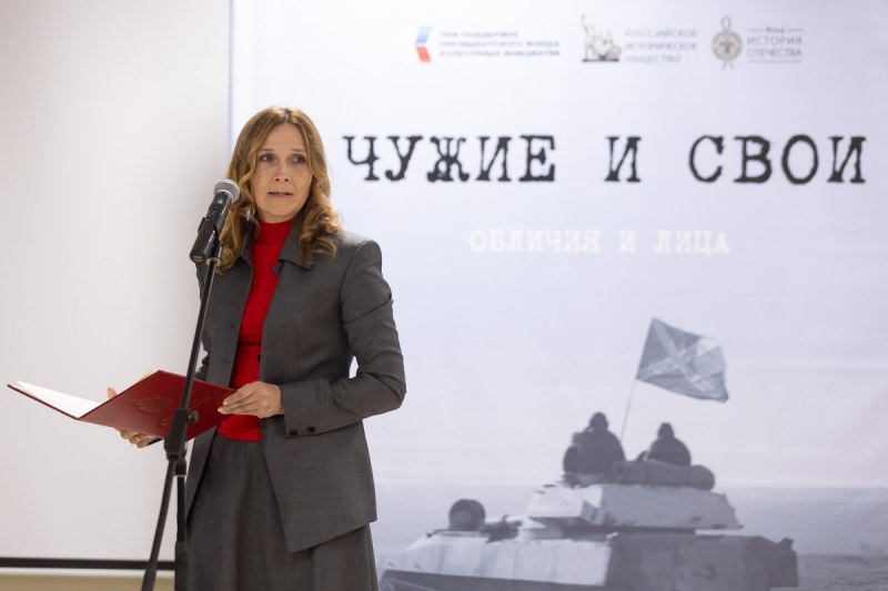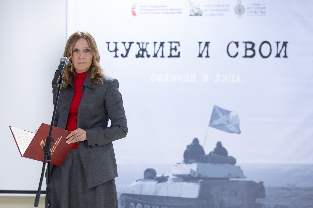 Первыми посетителями выставки «Чужие и СВОи. Обличья и лица» стали семьи погибших участников СВО и родственники военнослужащих. О наполнении экспозиции им подробно рассказала руководитель выставочных проектов фонда «История Отечества» Наталья Капустникова.