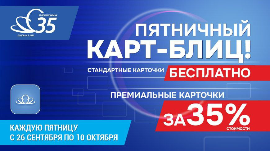 Белгазпромбанк в честь своего 35-летнего юбилея проводит с 26 сентября по 13 октября 2025 года акцию "Пятничный карт-блиц". В течение трех недель по пятницам вы сможете дистанционно оформить одну из "классических" карточек бесплатно или одну из премиальных карточек за 35% стоимости. Каждый раз набор "акционных" карточек будет разным, а подробности первого "Карт-блица" станут известны уже в ближайшую среду, 24 сентября.