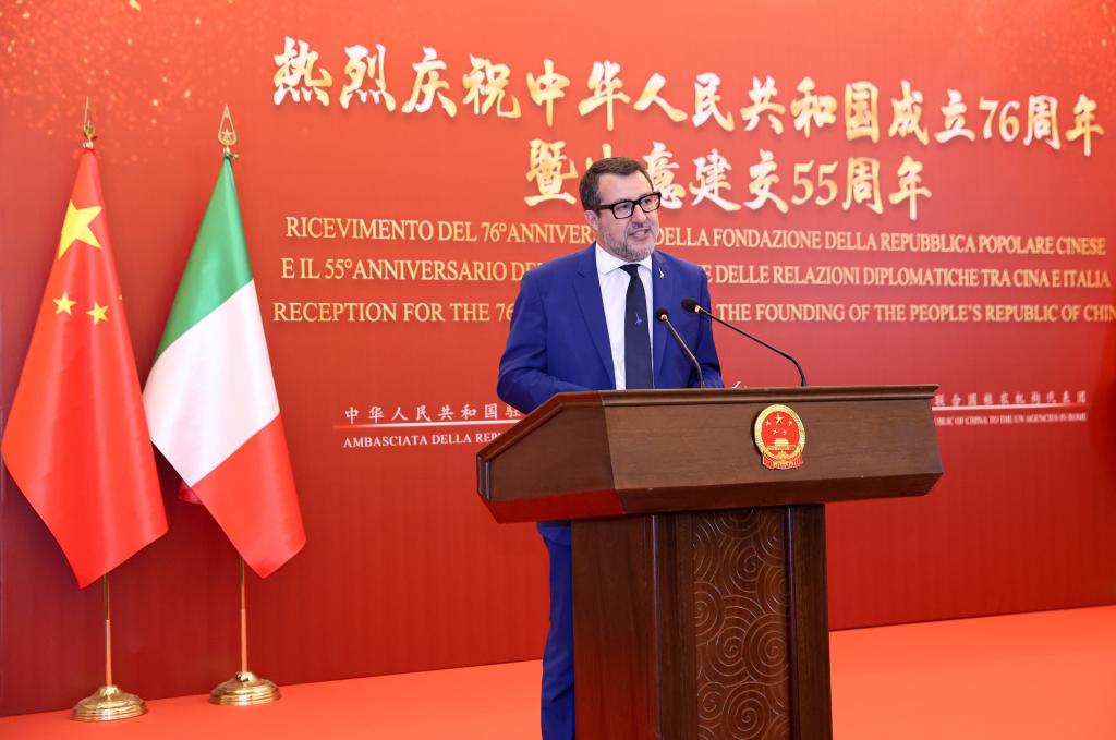 16 сентября, Рим. Вице-премьер, министр инфраструктуры и транспорта Италии Маттео Сальвини на торжественном приеме, посвященном 76-летию образования КНР и 55-й годовщине установления китайско-итальянских дипломатических отношений. /Фото: Синьхуа/