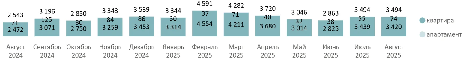 В августе 2025 года на рынке новостроек Московской области было зарегистрировано 3,5 тыс. ДДУ (без изменений за месяц, +37% за год), с апартаментами – 74 сделки, с квартирами – 3,4 тыс.