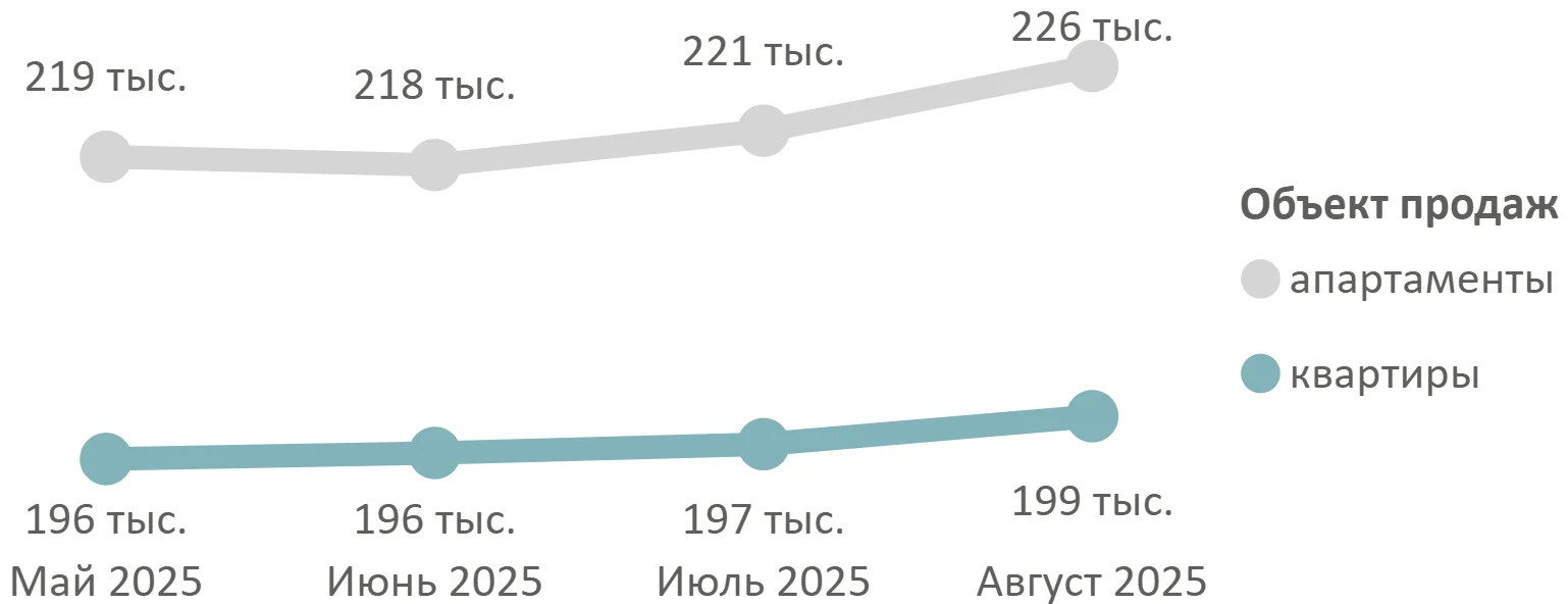 По подсчетам аналитиков «Метриум», средневзвешенная цена квадратного метра квартир и апартаментов по итогам августа 2025 года составила 199 520 руб. (+1% за месяц, +6% за год). Средневзвешенная цена квартир – 198 890 руб. за кв. м (+1% за месяц, +6% за год), апартаментов – 225 660 руб. за кв. м (+2% за месяц, +26% за год).