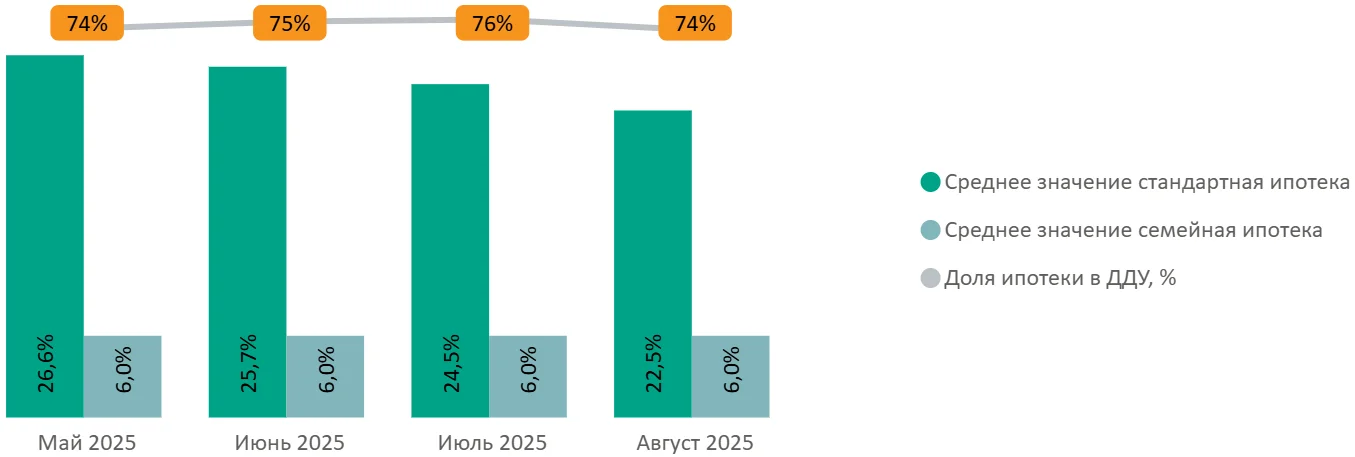 Доля сделок с привлечением ипотечного кредита к июлю достигла 74%, относительно июля 2025 года показатель сократился на 2 п.п. Средняя ставка по стандартной ипотеке в августе составила 22,5% (-2 п.п. за месяц).