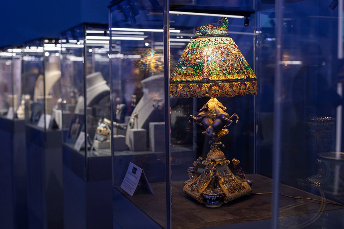 Говоря об экспонатах выставки в рамках МФФ-2025 Галина Ананьина рассказала о следующих изделиях: уникальное изделие Золотых дел мастерской «Хризолит», которое создавалось мастерами пять лет: настольная лампа «Сказы Амура», созданная по мотивом сказки «Конёк-Горбунок». Тиары, которые заимствовали мотивы русского кокошника, потрясающие броши, навеянные образами русских сказок.