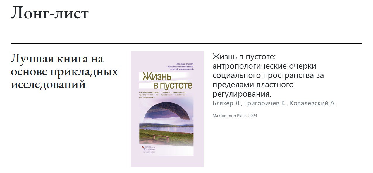 Книга «Жизнь в пустоте: антропологические очерки социального пространства за пределами властного регулирования» вошла в число претендентов по номинации «Лучшая книга на основе прикладных исследований».