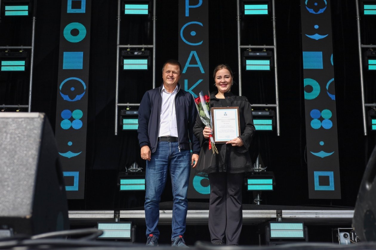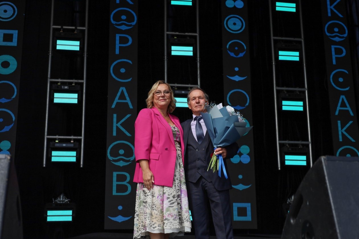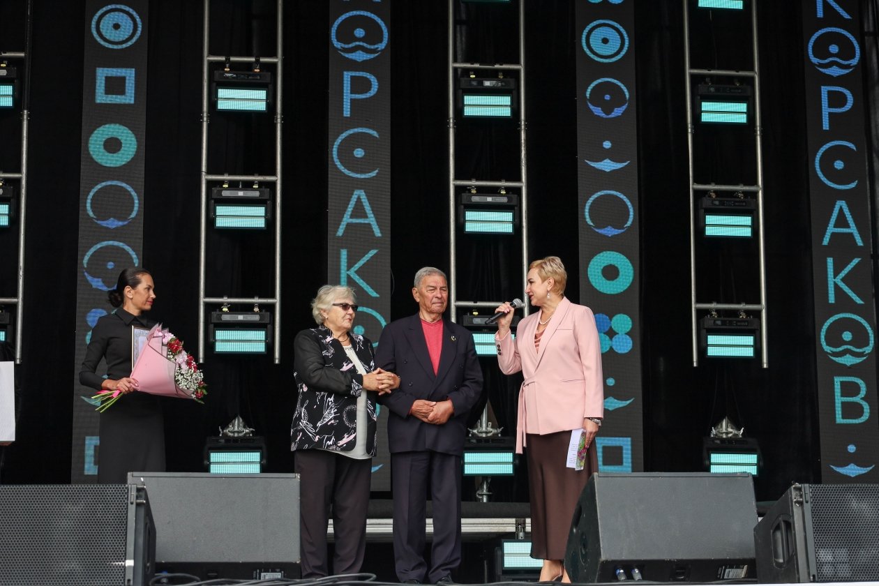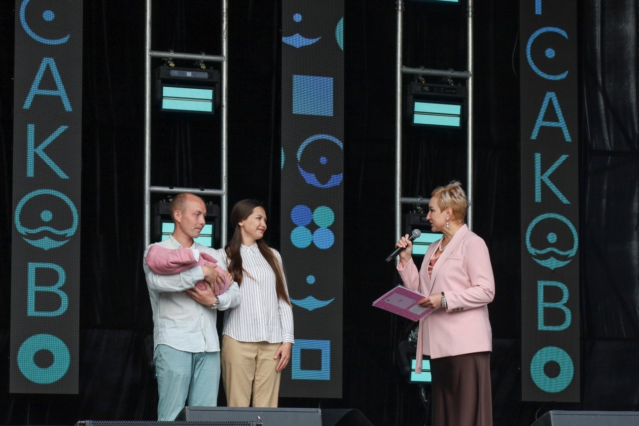 На сцену пригласили молодую семью Коротких — Валерия и Марию, которые накануне Дня города стали родителями дочери Тани. Родителям торжественно вручили свидетельство о рождении. А также аплодисменты получила супружеская пара Геннадий и Любовь Куприяновы, отметившие 55-летие совместной жизни. Более 60 лет их труд посвящен развитию Корсакова.