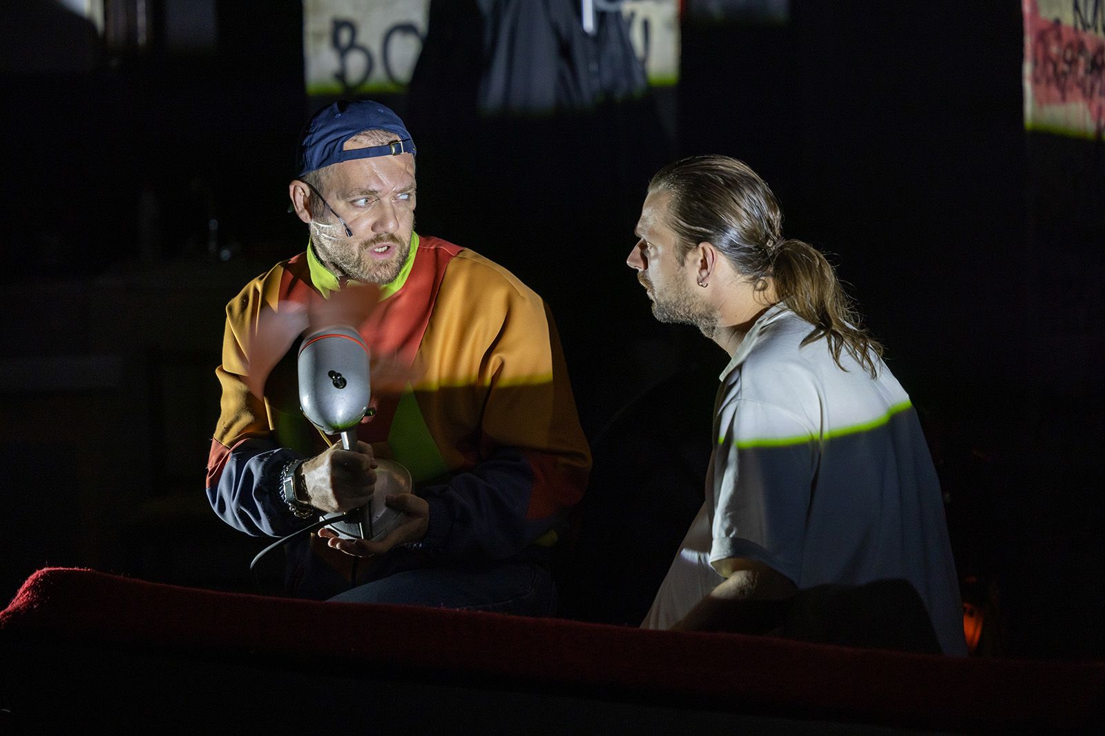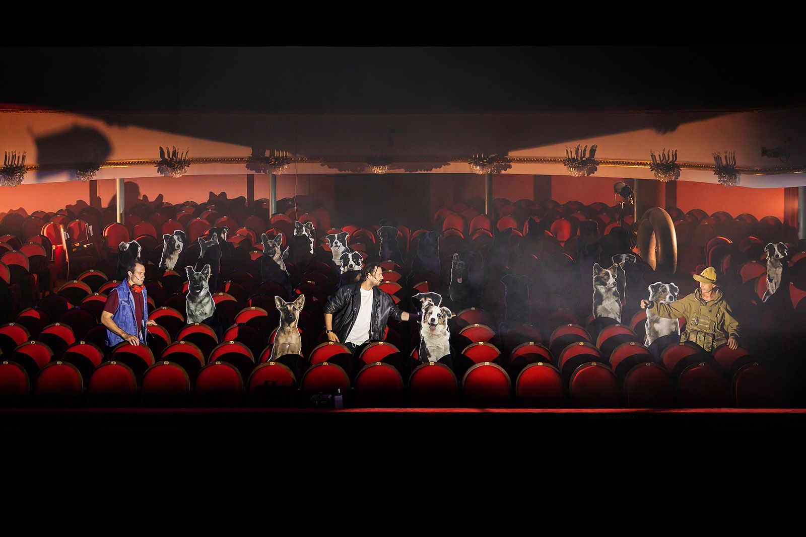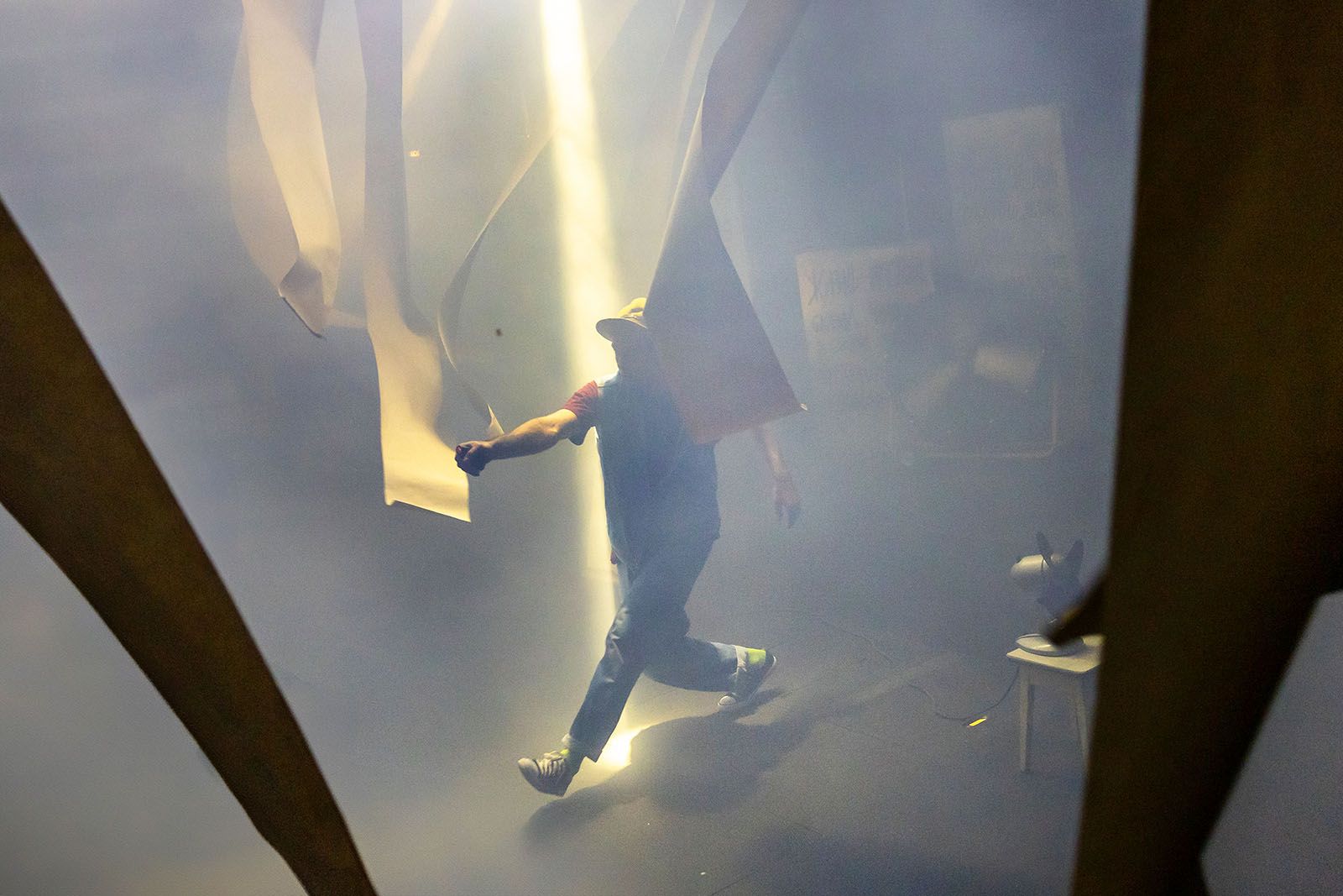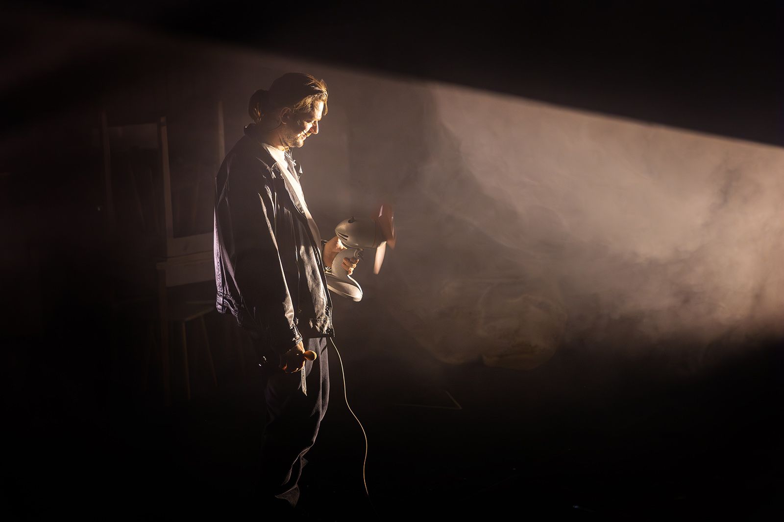 Жанр постановки обозначен как «диорама безумия». С безумием все более или менее понятно, и диораму тоже следует понимать буквально. Зритель помещен на сцену, которая по ходу действия вращается на 360 градусов — проносится вихрь образов, персонажей, видений, обрывков фраз, знакомых, но совершенно невозможно вспомнить, откуда. Именно так работает подсознание, и в этом смысле постоянный соавтор Перегудова сценограф Владимир Арефьев выбрал, пожалуй, самый точный инструмент. Кто хорошо знаком с творчеством этого дуэта, знает, что очень часто в своих постановках авторы обращаются к тем или иным стихиям: то четыре часа идет самый настоящий дождь, то сцена превращается в водоем, то тают там огромные сосульки. Здесь же главный герой — ветер. Именно он руководит происходящим, а зритель чувствует его кожей. И именно ветер украл лицо одного из главных персонажей.