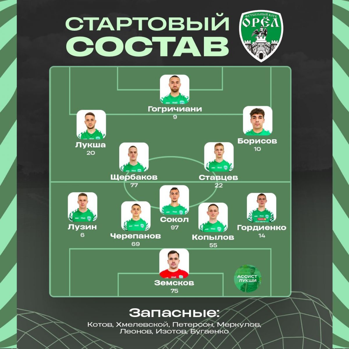 Лукша и Гогричиани в старте, Тарасов пропустит матч из-за болезни: состав ФК Орел на игру в Питере