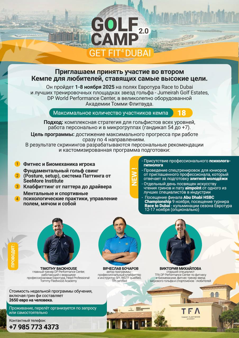 Гольф-клуб Завидово и Вячеслав Бочаров приглашают на новый гольф кемп Get Fit4 в Академию Томми Флитвуда в Дубае, с 1 по 8 ноября 2025.
