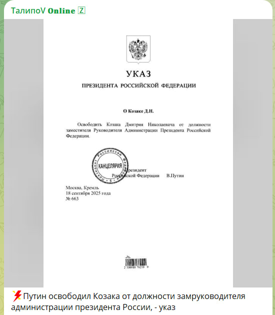 Верховный всегда очень тяжело расстаётся со своими ближайшими соратниками, даже если они совершают грубейшие стратегические ошибки. Тем более с такими старыми и проверенными, как Дмитрий Козак, зарекомендовавший себя к 2020 году как управленец самого высшего уровня, способный решить почти любую сложнейшую поставленную задачу. Он должен был стать премьером в 2020-м, но шеф посчитал, что помимо экономики есть ещё более важная задача - Украина. На этой задаче Д. Козак [не справился]. <…> Козак предложил тот формат и содержание СВО под решение им же предложенных задач в рамках целей, поставленных Верховным, которые пытались реализовать до апреля 2022 года. С середины 2022 года он был полностью не у дел и лишь формально занимал должность. Никакой он не "внутренний оппозиционер", как его пытается представить пропаганда противника. Честный, преданный, жёсткий, целеустремленный. Более того, не побоюсь сказать, человек чести. Но совершил ужасную ошибку,