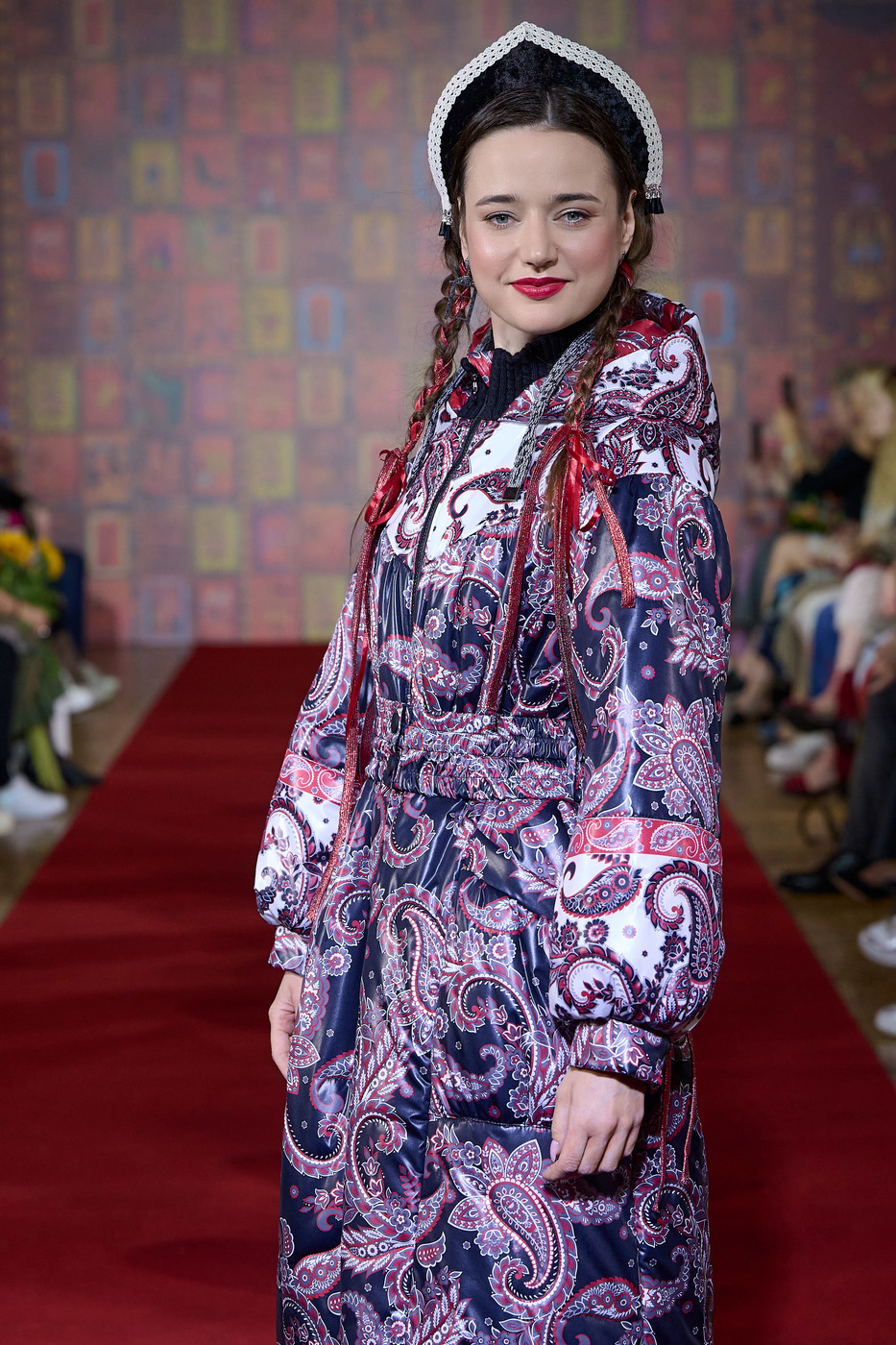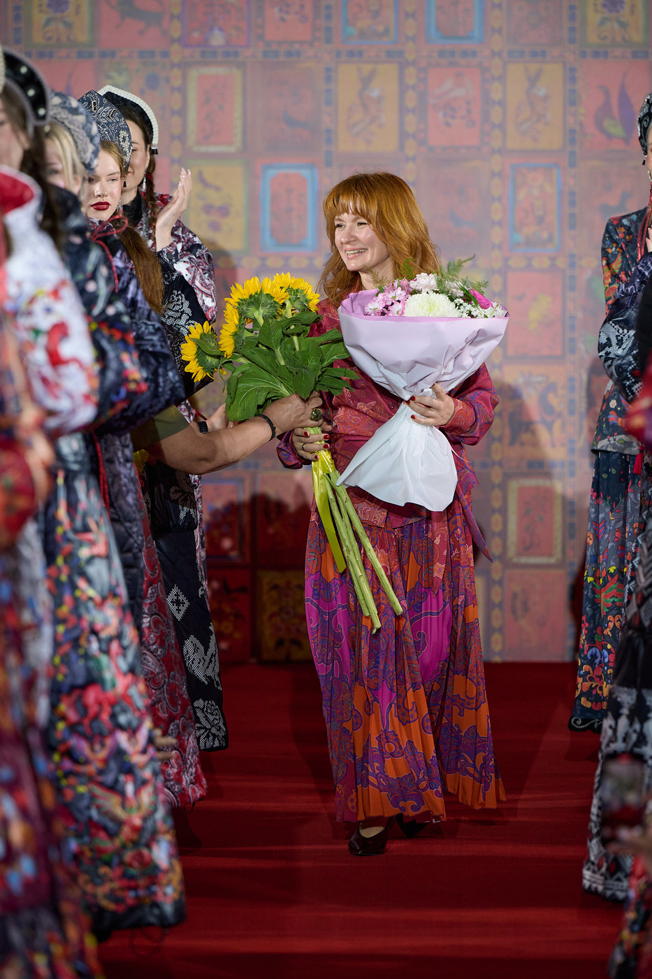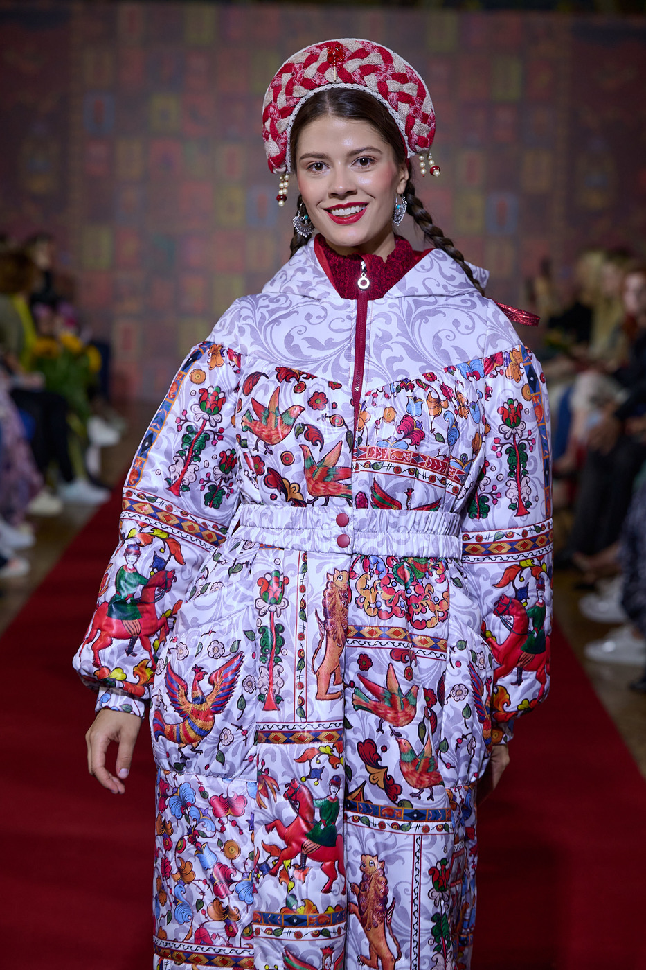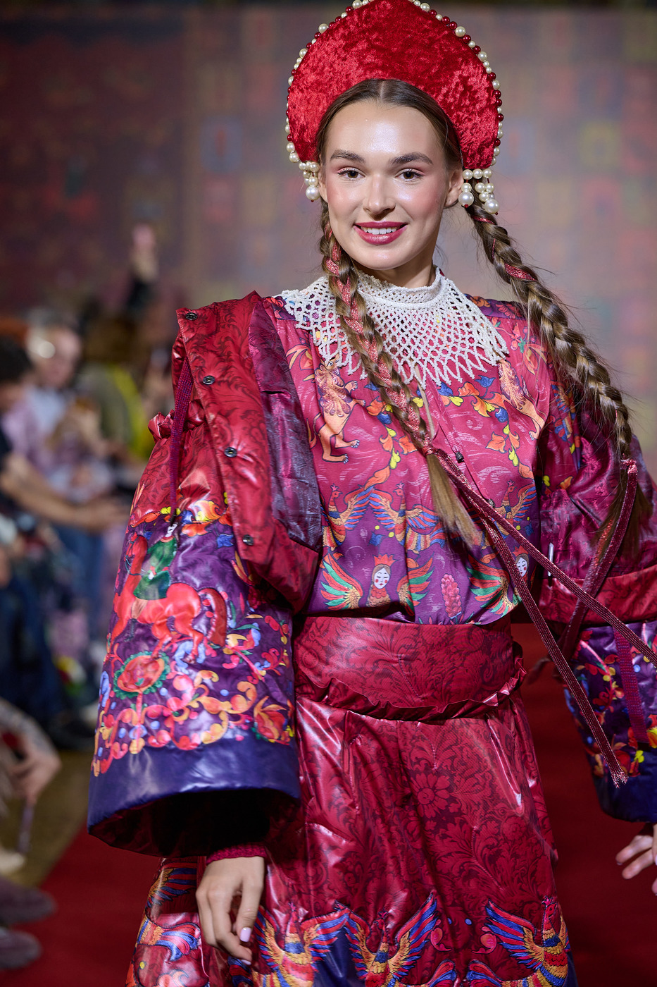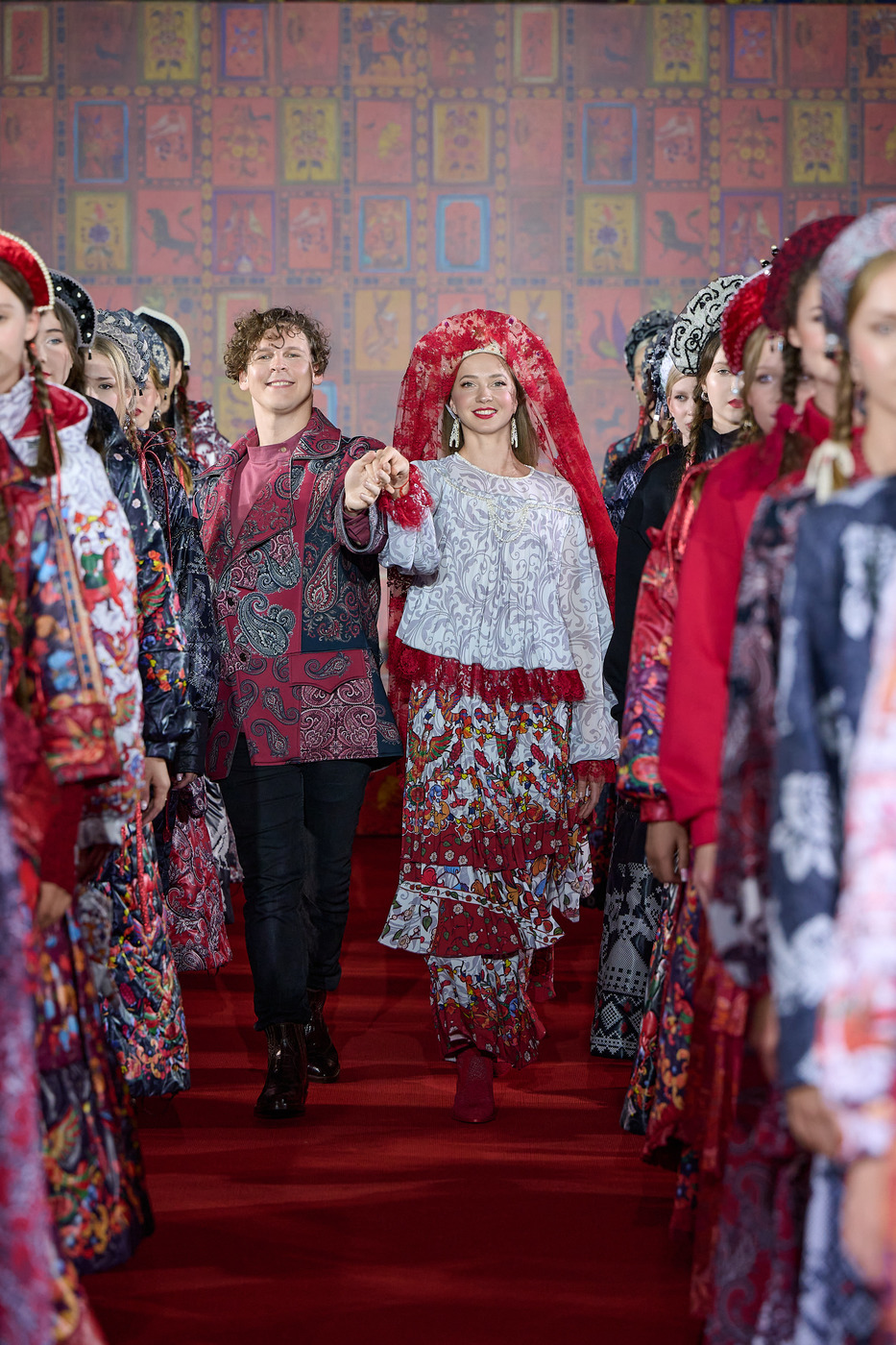 По традиции дефиле от Натальи Душегреи проходило в увлекательном театрализованном формате: в формате свадебных гуляний. В образах жениха и невесты предстали актер театра и кино, театральный режиссер Максим Метельников и чемпионка Юношеских Олимпийских игр, двукратная чемпионка Европы по художественной гимнастике Дарья Дубова.