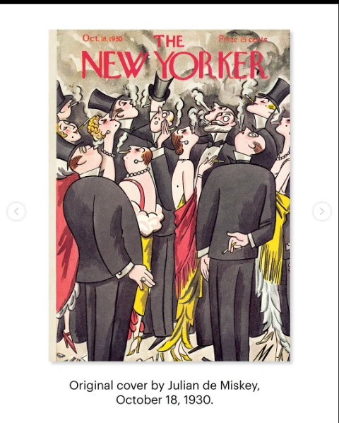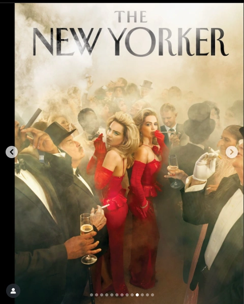 Алекс Прагер оживила обложку Джулиана де Миски 1930 года, изображающую светский прием с сигарами и жемчугом. На ее фото актрисы Софи и Элли Тэтчер (идентичные близнецы) в красных вечерних платьях стоят спиной к спине среди мужчин в смокингах, повторяя оригинальную иллюстрацию.