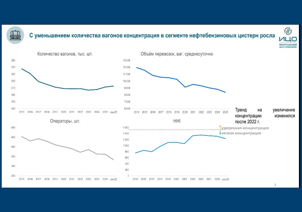 «Сегмент постепенно сокращается как в плане объёмов, так и количества подвижного состава. Падает и число операторов, в первую очередь уходят мелкие компании, соответственно, более крупные остаются, что отражено и ростом концентрации. Общий тренд на увеличение наблюдался в последние 10 лет, прерываясь в шоковые периоды. Но начиная с 2022 года, тренд “сломался”, концентрация затормозилась и перестала увеличиваться. В последний год она даже начала снижаться», — отметил г-н Михайлов.