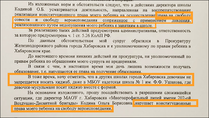 Тем не менее в Сети отметили, что скандал уже дошёл до маразма. Всё произошло в хабаровском лицее имени 202-й Воздушно-десантной бригады, правилами которого установлен запрет на ношение религиозной одежды. Директор Ольга Кодина сделала замечание ученице 3-го класса, которая находилась на уроке в хиджабе.