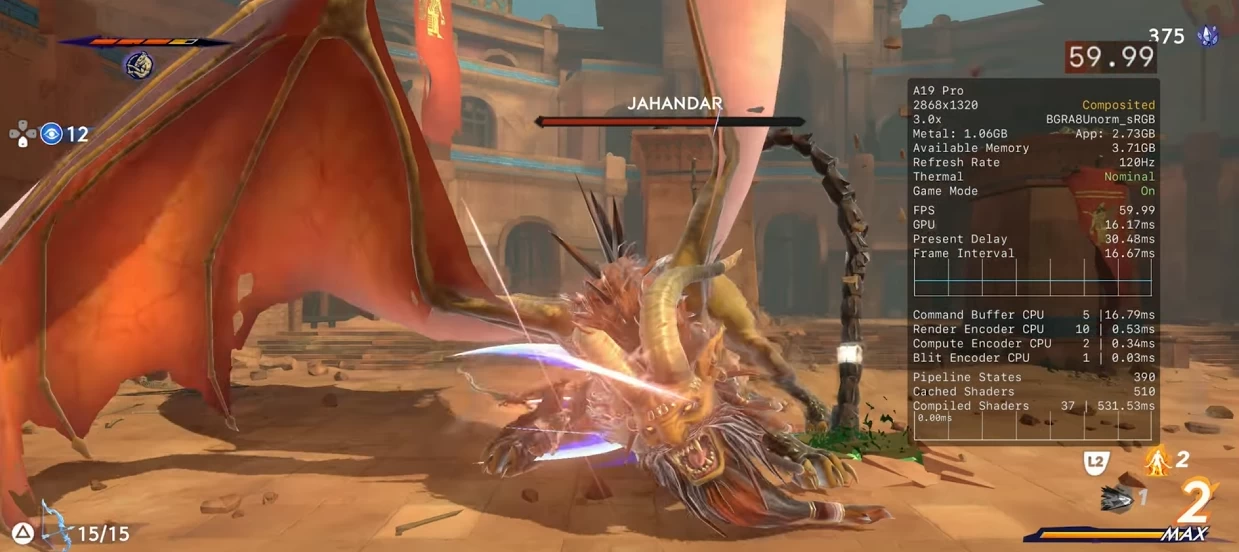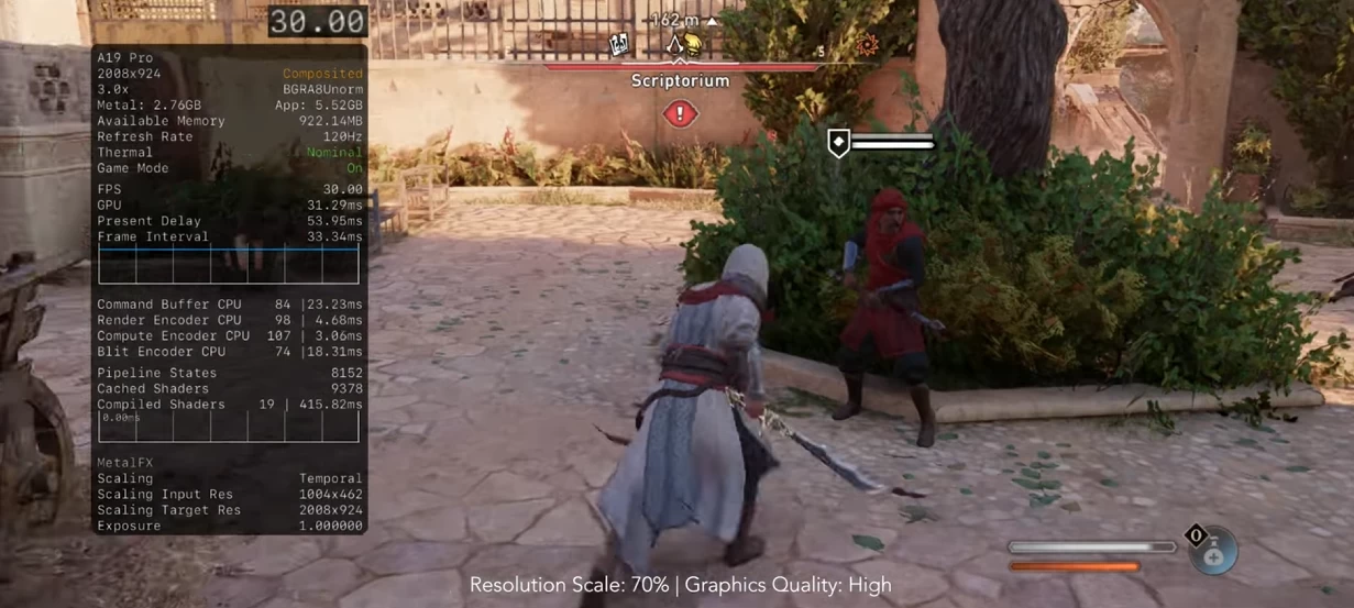 При этом разница по сравнению с предыдущими поколениями заметна невооружённым взглядом — в местах, где даже A18 Pro выдавал 19 кадров, у A19 Pro получается оставаться в зоне 25-30 кадров.