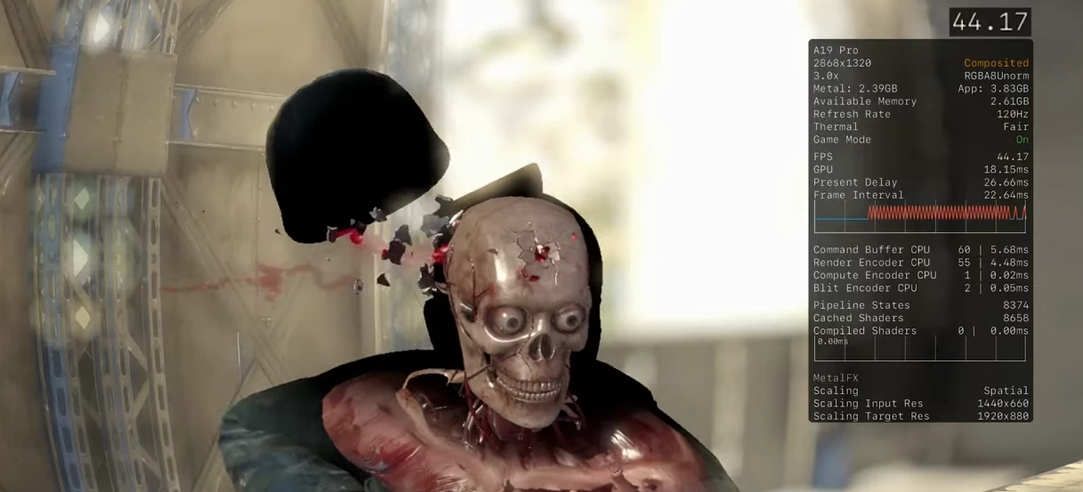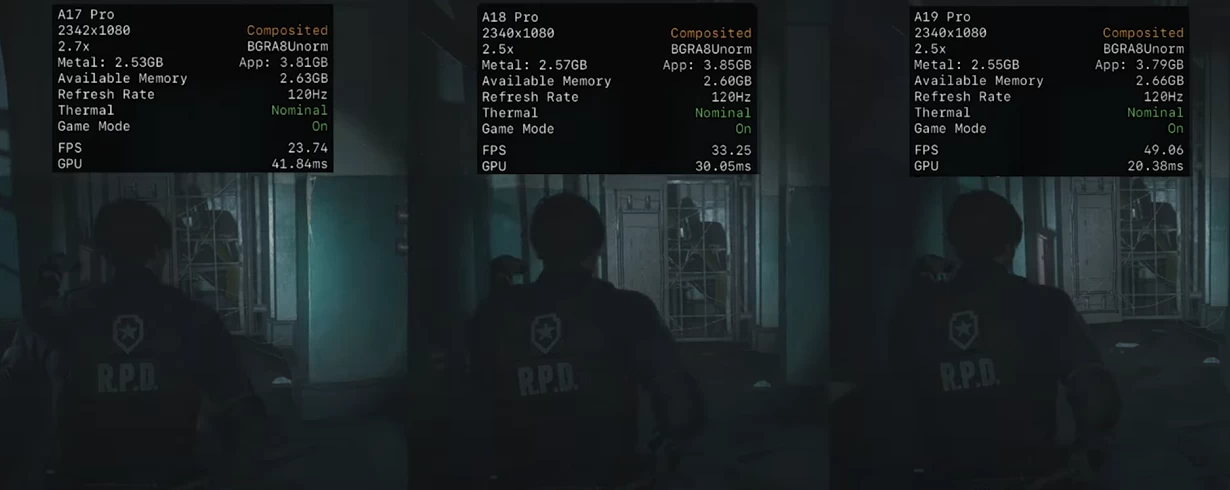 Первая игра — Resident Evil 2 Remake. В режиме «Производительность» и в разрешении 1080p получаем 49 FPS и задержку в 20 мс. Достойный результат по сравнению с A17 Pro и A18 Pro. Чтобы достичь стабильных 60 FPS с таким разрешением, нужно использовать апскейл MetalFX с пресетом «Качество» (оригинальное разрешение — 540p). Но за всё нужно платить — с MetalFX появляется «шлейф» при движении и артефакты. Если хотите играть с пресетом графики «Качество» без апскейла, придётся мириться с локом в 30 FPS.