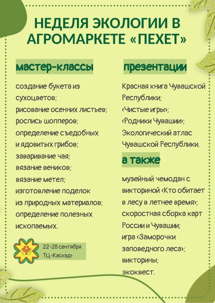 Открытие недели, 22 сентября, будет особенно насыщенным: с 11:00 до 19:30 запланированы мастер-классы по флористике, рисованию, росписи шоперов, а также презентация проекта «Чистые игры» и лекция о грибах от сотрудников Чебоксарского лесничества.
