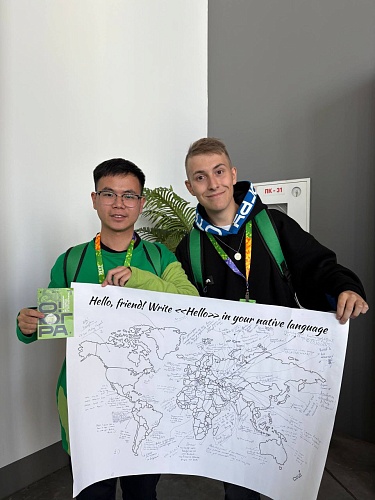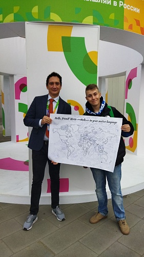 «Когда я узнал о том, что прошел на слет ВФМ у меня появилась идея - распечатать карту мира и предложить участникам написать «Привет» на их родном языке, а также различные пожелания для молодежи всего мира. Я собрал приветы и пожелания почти со всех стран нашей планеты! Честно, такого результата я не ожидал и это очень круто! В последний день слёта нашёл участника из Австралии. Он был единственным представителем страны. Это невероятная удача», - рассказал Данил.