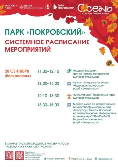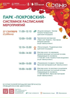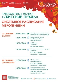 В парке «Скитские пруды» пройдут занятия по танцам от клуба «Активное долголетие», петанк, тренировка «Здоровая спина», вакцинация от гриппа в мобильном ФАПе на главной аллее и субботник «Чистябрь».