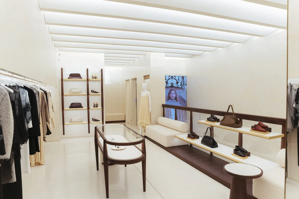 Занимая два уровня и 250 кв. м, флагман отличается сдержанным минималистичным декором в белой гамме. «В выборе материалов предпочтение отдано нейтральным тонам и мягким поверхностям, в диалоге со встроенным освещением, создающим мягкий, естественный эффект. Каждая часть бутика формирует гостеприимную и интимную атмосферу, сохраняя при этом дух вневременной элегантности, присущий дому», — говорится в пресс-релизе.
