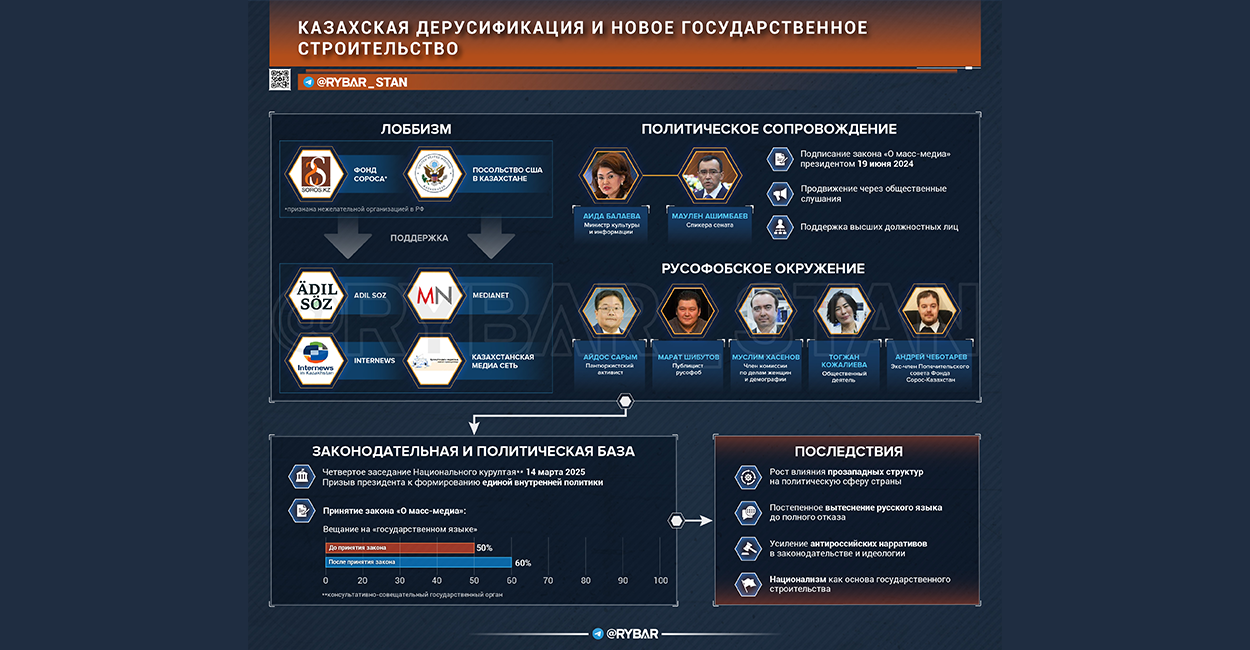 ▪️В 2024 году президентом подписан закон «О массмедиа», увеличивающий долю вещания на казахском языке до 60%. Закон лоббировали структуры, связанные с США и фондом Сороса.▪️В обсуждениях участвовали известные русофобы: Айдос Сарым, Марат Шибутов, Андрей Чеботарев и другие, активно продвигающие антироссийские нарративы.