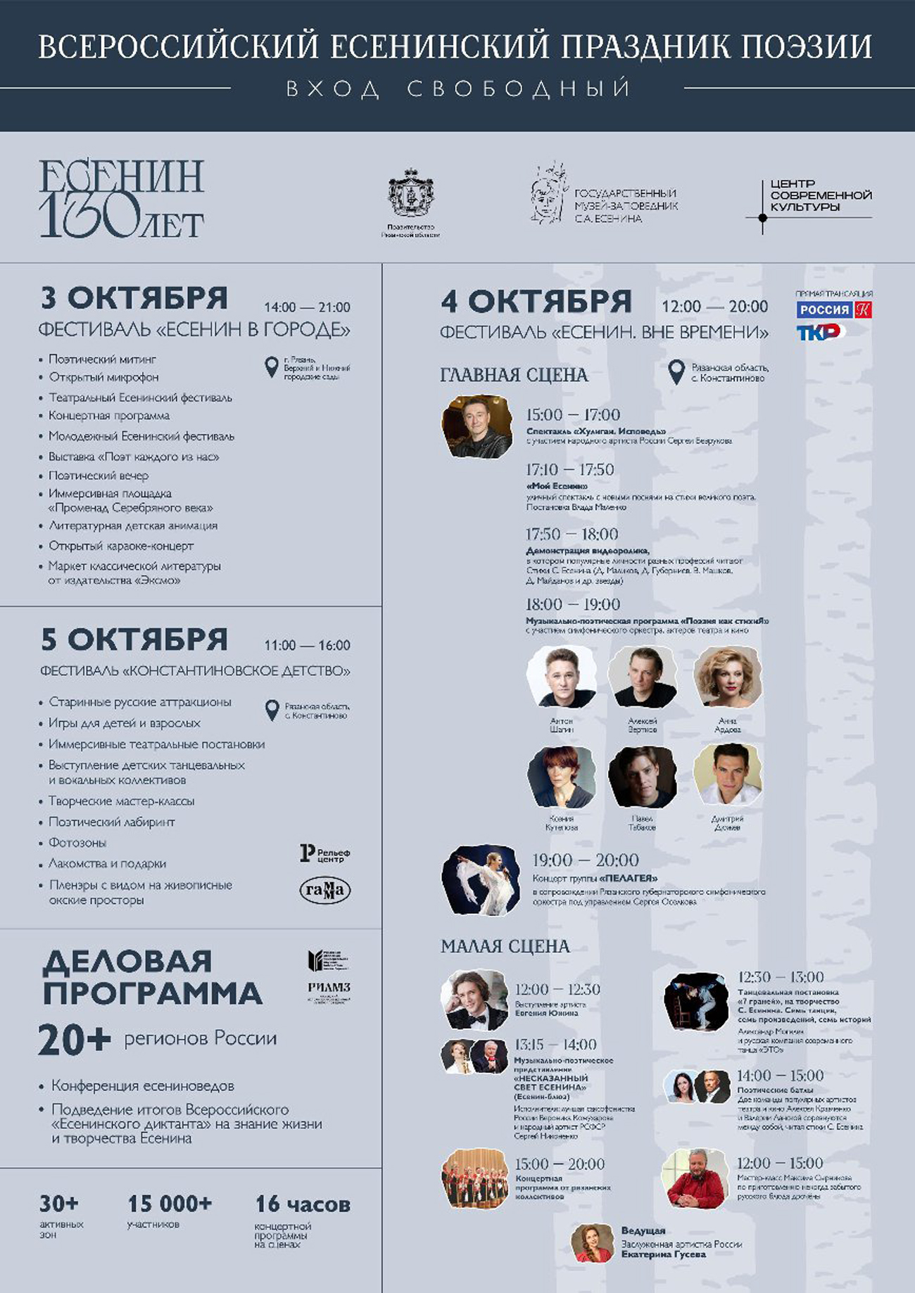 С 3 по 5 октября Рязань и село Константиново станут центром празднования 130-летия со дня рождения Сергея Есенина. В группе музея-заповедника опубликована программа празднования. Всероссийский есенинский праздник поэзии объединит более 30 культурных площадок.