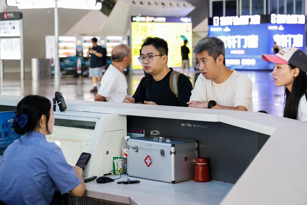 23 сентября 2025 года, пассажиры узнают информацию об отмене поездов в справочной службе на Южном ж/д вокзале Гуанчжоу. /Фото: Синьхуа/