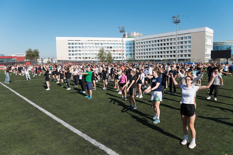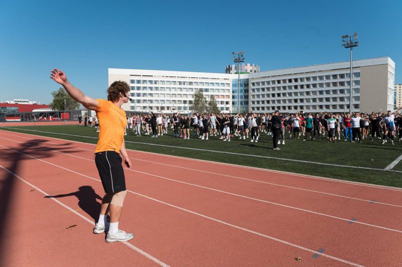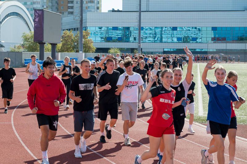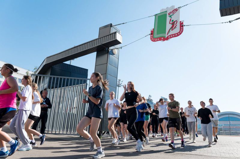 Перед стартом — разминка! Студенты и руководство университета размяли мышцы, зарядились позитивной энергией, а после вышли на старт. Пару кругов по стадиону БГУФК, а затем побежали в сторону Минск-Арены. Всего дистанция составила около 3 км.
