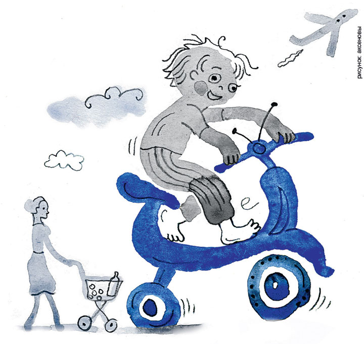 Но я ему все объяснил. И про сандалики, и про скутер. И он поехал. За три минуты он научился включать задний ход, он лавировал, лавировал и вылавировывал в толпе людей, не очень-то расступавшихся перед ним.