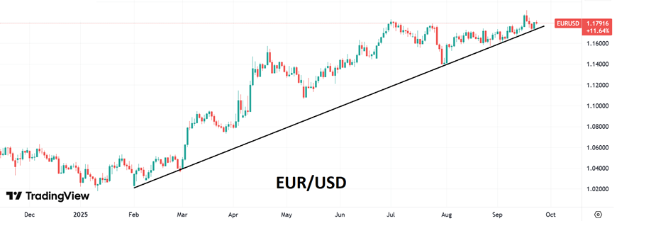 Опубликованный накануне индекс потребительских настроений в еврозоне в сентябре вырос до -14,9 по сравнению с -15,5 в августе, и превзошёл рыночные ожидания в -15,3. Более высокий показатель обусловлен снижением стоимости заимствований и снижением инфляции в последние месяцы. Тем не менее, неопределённость относительно налогово-бюджетной политики в Европе и потенциальное влияние торговых пошлин могут омрачить перспективы экономического роста. Этот индекс потребительских настроений в еврозоне длительное время держится в отрицательной зоне поскольку отражает целый комплекс экономических и социальных факторов, оказывающих давление на уровень потребительской уверенности (геополитическая неопределённость, инфляционные ожидания, замедление экономического роста, высокая долговая нагрузка домохозяйств, сдержанное настроение потребителей).
