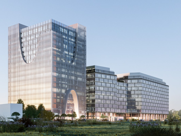Здание второй очереди – это два соединенных между собой объема. Центральная сквозная арка станет связующим элементом между природным окружением и экстерьером башни бизнес-центра «STONE Мнёвники», создавая единую проницаемую территорию с новыми пешеходными маршрутами.