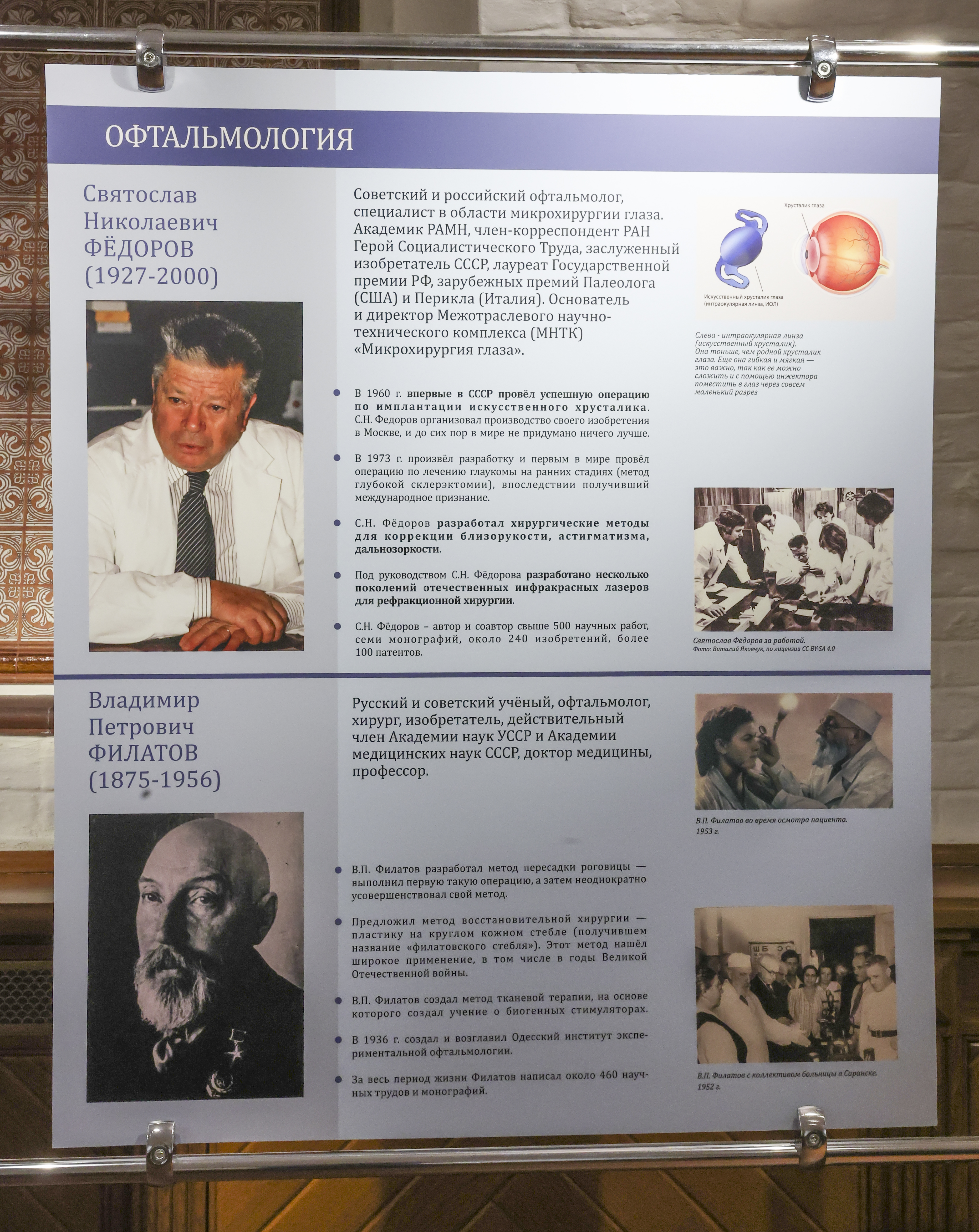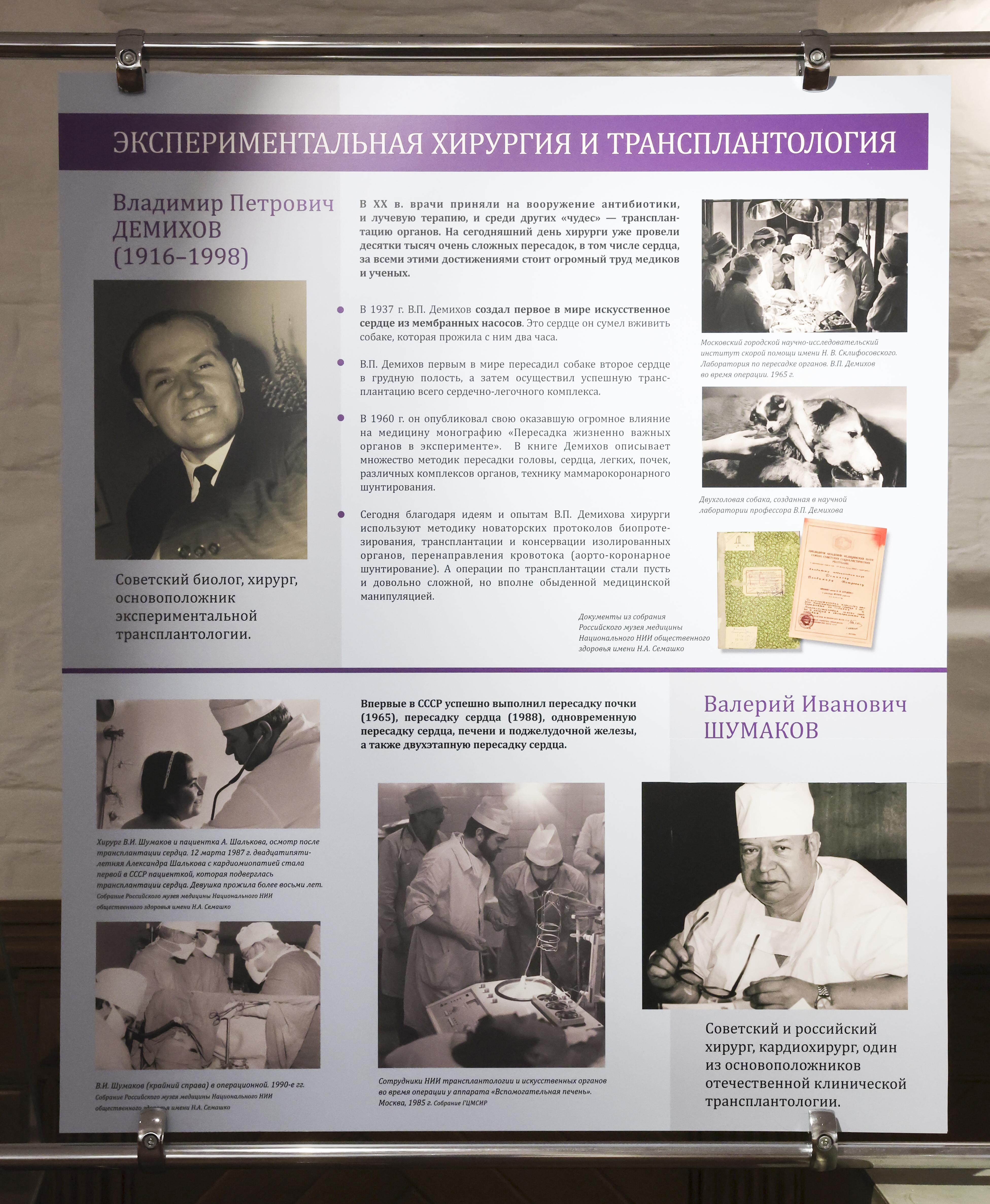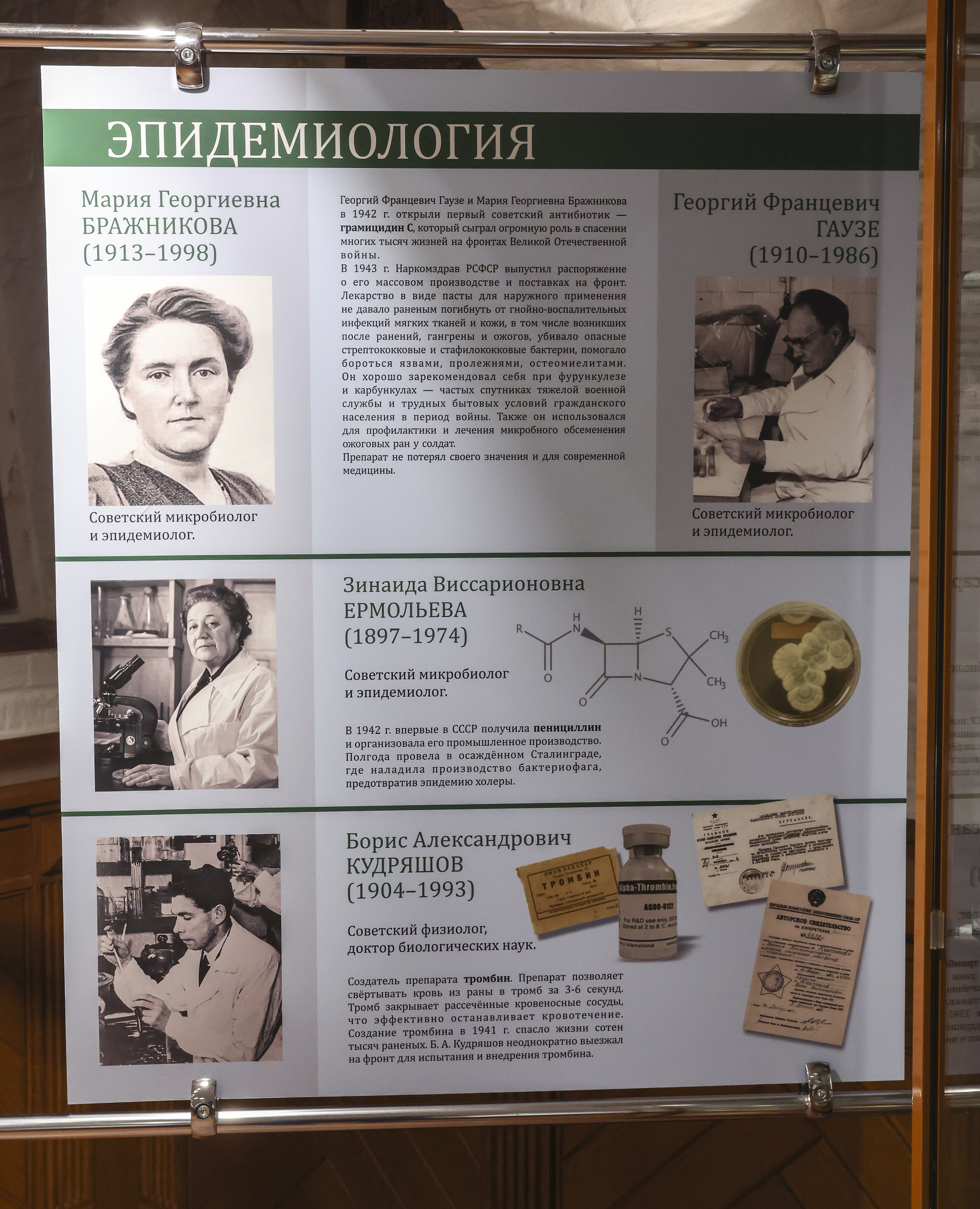 Здесь можно увидеть образцы отечественных вакцин, спасших миллионы жизней по всему миру, первый в истории аппарат искусственного кровообращения, протез роговицы глаза и многие другие уникальные экспонаты. За каждым из них — история успеха, история успешного научного поиска и многих лет напряжённого интеллектуального труда».