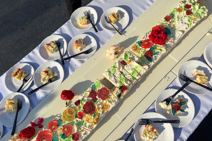 Юбилейный торт не обошелся без зажженных свечей и загадывания желаний. После этого десерт разрезали на множество кусочков, продегустировать смогли все желающие.
