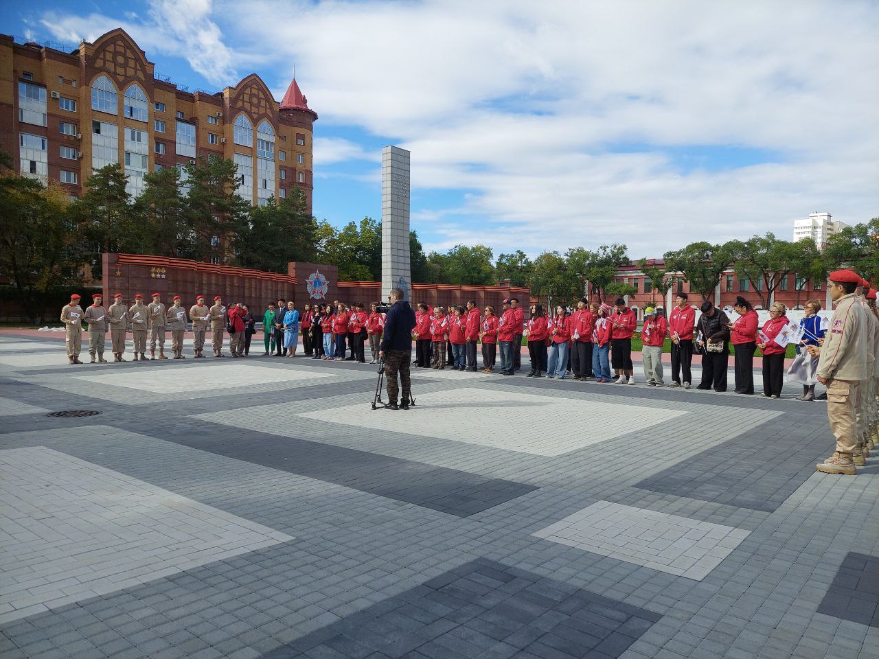 Прибыв в город Благовещенск, делегаты Международного культурно-образовательного проекта «Поезд дружбы: Вместе к Победе!» совместно с участниками проекта из Амурской области возложили цветы к монументу «Защитники Отечества».