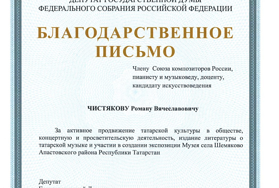 Нашего наставника поблагодарил депутат Марат Нуриев, представляющий в Государственной Думе Республику Татарстан. Роман Вячеславович поощрен за продвижение татарской культуры в обществе, концертную и просветительскую деятельность, издание литературы о татарской музыке и участие в создании экспозиции музея села Шемяково Апастовского района.