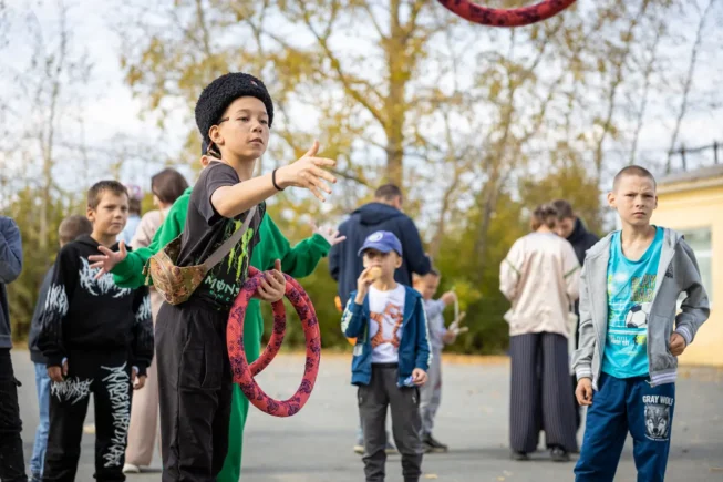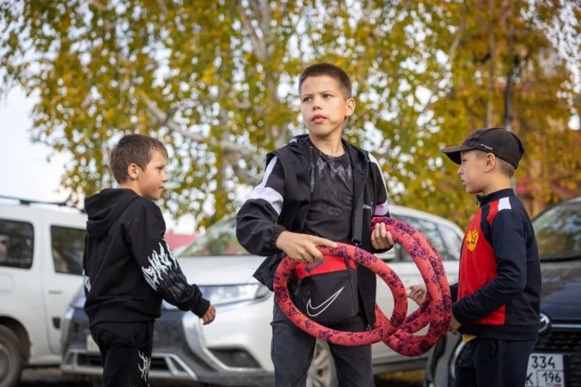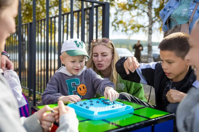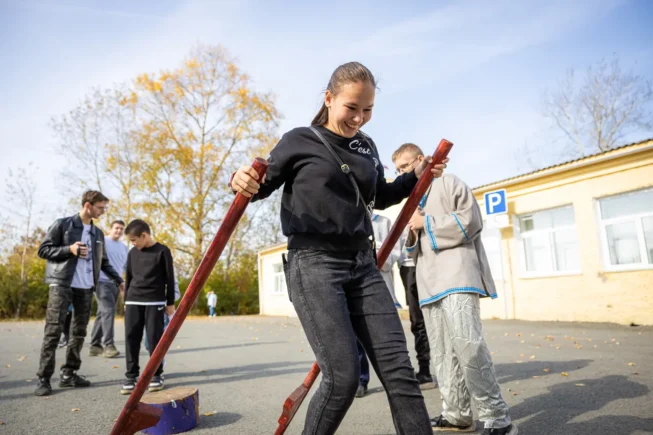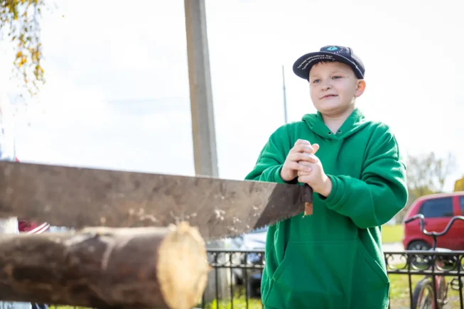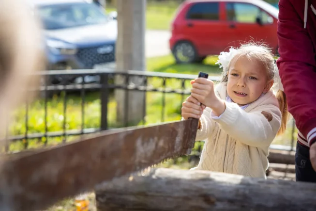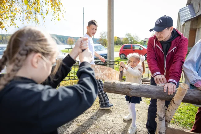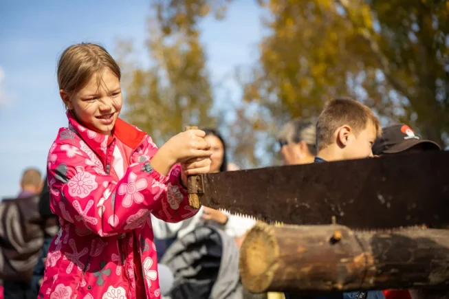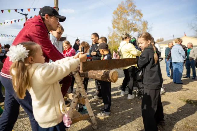 После этого на пятачке у клуба развернулись детские игровые локации — кольцеброс, ходьба на ходулях, магнитная настольная игра и другие игры на ловкость. За победу каждому полагался пряник или конфета. Рядом на полянке детям предлагали попробовать распилить бревно настоящей пилой. «А у меня не получается!», «Оказывается, это сложно!», «А я уже пилил бревна с папой!» — слышалось с этой стороны.