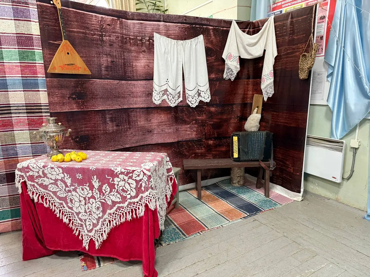 Еще здесь была фотозона: организаторы накрыли красной скатертью стол, установили самовар, блюдо с наливными яблочками, рядом — лавочку, на которой стояла старинная гармонь, а еще были пяльца, лапти, балалайка и половичок — все атрибуты домашней избы прошлого века.